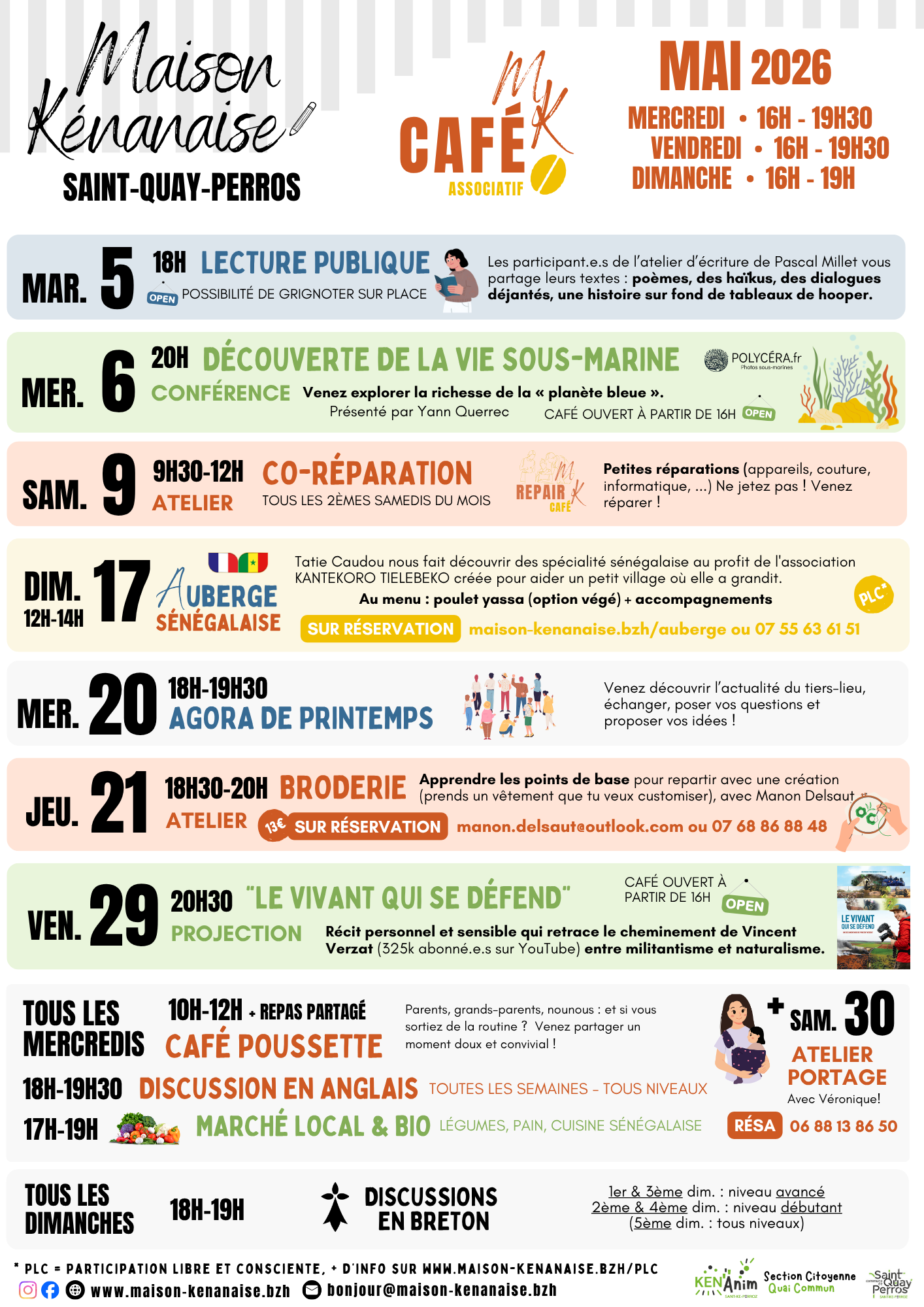 Sur la place du village de Saint-Quay-Perros, au vert entre Lannion et Perros-Guirec, à proximité de la Côte de Granit Rose, la Maison Kénanaise (ou MK) est un lieu où il fait bon y passer du temps ! Ouvert à l’année, nous vous accueillons au café disposant d’une terrasse, d’un espace kids friendly, de produits locaux, de jeux et livres, d’un espace de coworking et d’une salle événementielle.